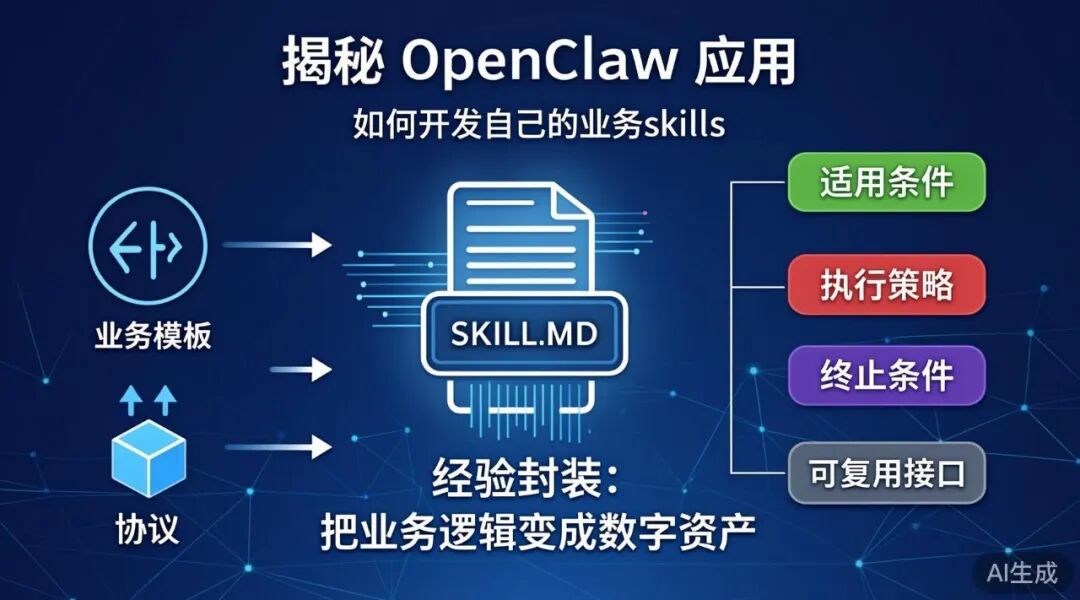 概况开发业务 Skills 需通过 SKILL.md 定义身份与流程,结合业务模板与协议实现跨平台调用。成熟的 Skill 需包含适用条件、执行策略、终止条件和可复用接口四个核心组件。
