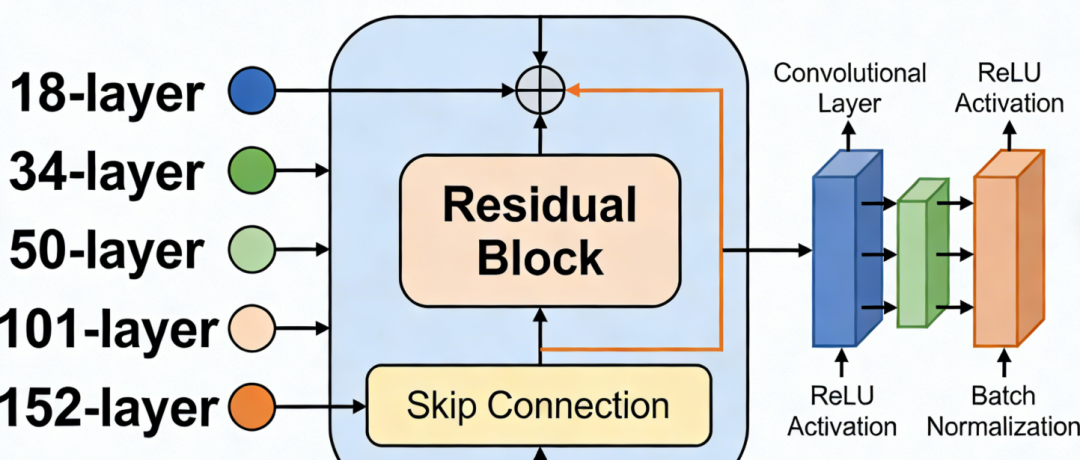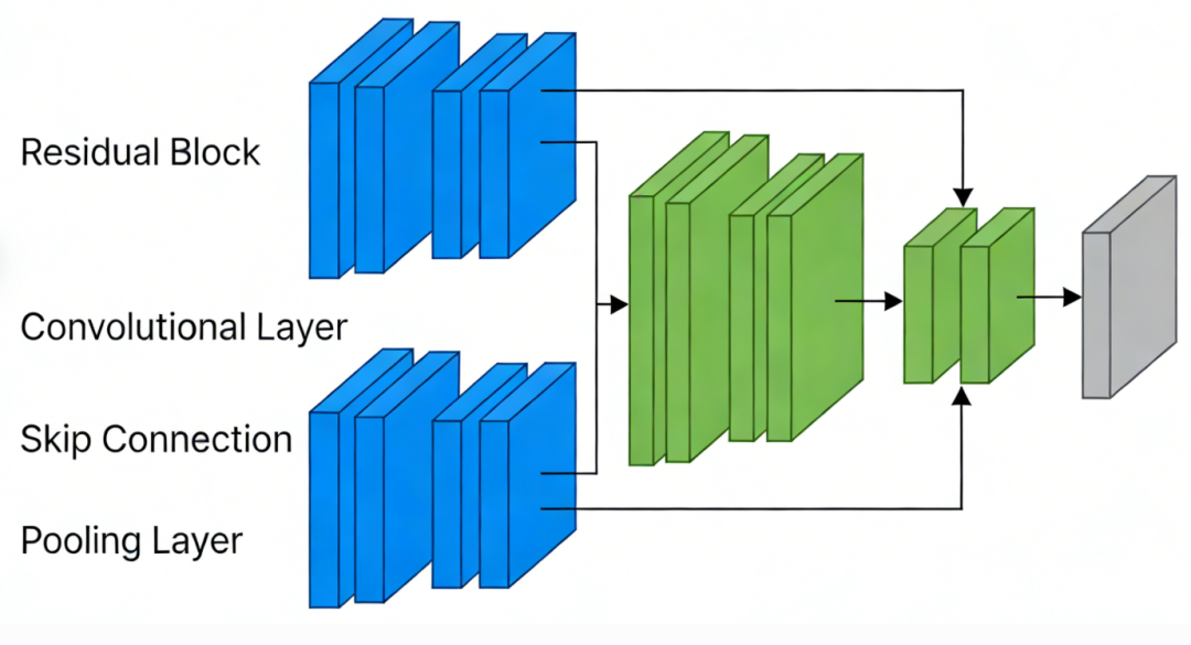 其中 x 是输入,F是需要学习的残差函数(通常是两三层卷积),而 x通过“短路连接”直接与输出相加。