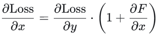 常数项1保证了梯度不会消失,即 使 ∂F/∂x很小,梯度也能有效传播。