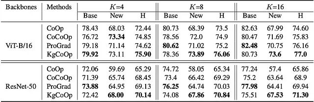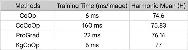Lkg 项在现有框架里的兼容性。Lkg 约束不是一个孤立的技巧,它完全可以作为插件融合到其他的 Prompt Tuning 架构当中。从 ViT-B/16 的训练时间与性能表可以看出,外挂知识引导约束后,CoCoOp 和 ProGrad 的新类别性能和调和均值都出现了一致的上扬。