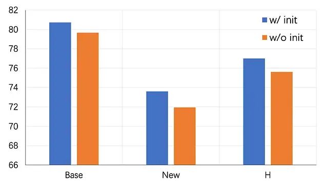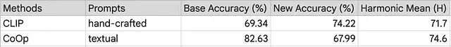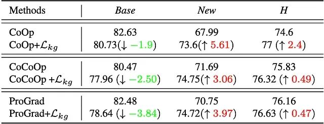 CoCoOp 叠加 Lkg 后,新类别准确率从 71.69% 升至 74.75%,调和均值涨了 0.49%。ProGrad 叠加 Lkg 后,新类别准确率从 70.75% 升至 74.72%,调和均值由 76.16% 爬到 76.63%。