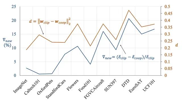 新类别性能损失的程度(▽new)与可学习 Prompt 嵌入(wcoop) 和原始手工 CLIP 嵌入(wclip) 之间的欧几里得距离直接一致。