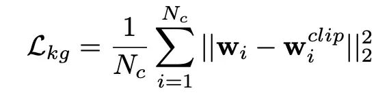 其中引入的知识引导损失 (Lkg),定义为微调后的嵌入 wi 与 CLIP 锚点 (wi^clip) 之间的均方欧几里得距离: