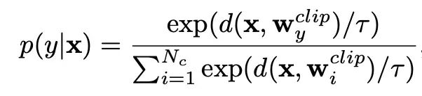 零样本 CLIP 中,图像嵌入 x 和类别 y 的预测概率 p(y|x) 计算方式为: