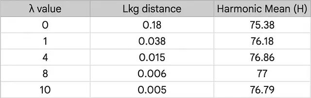 定量分析揭示出一个直接规律:增大 λ 可以减小 Lkg 距离,迫使学习得到的 Prompt 进一步贴近手工 Prompt。距离收窄带动的调和均值拉升在 λ=8.0 时见顶。继续加大 λ 会让约束变得过于苛刻,反而阻断了模型对当前任务特有判别特征的吸收,引发指标回落。只要约束在一个合理的区间内,最小化学习知识与通用知识间的偏差,确实是保持未见领域泛化水位的主力手段。