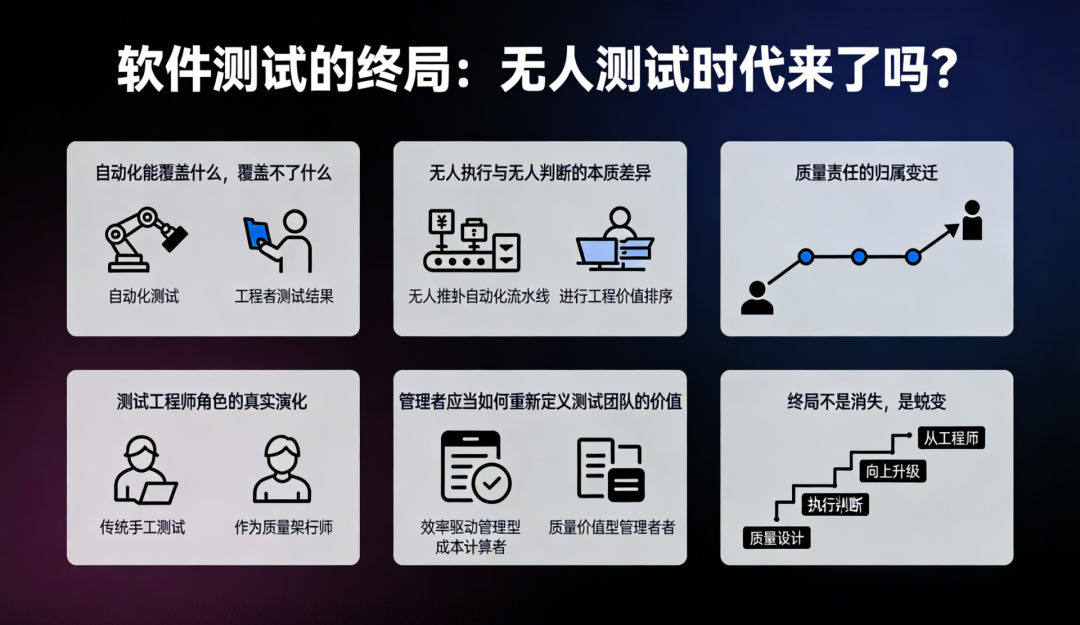 这两种定义,指向两种截然不同的终局。如果测试的本质是执行验证,那无人测试的时代确实在加速到来。如果测试的本质是判断质量,那人的角色不会消失,只会被重新定位——从流水线上的操作工,变成流水线的设计者与仲裁者。