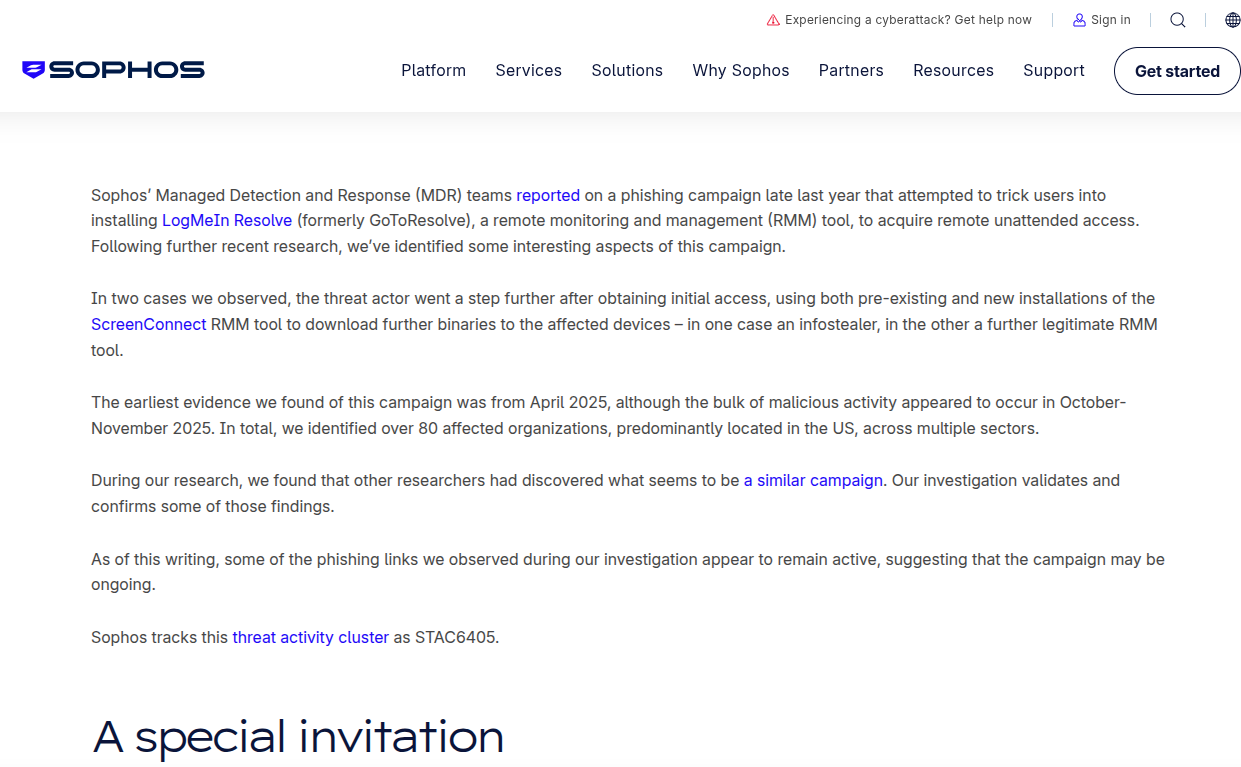STAC6405 是 Sophos 跟踪命名的一组跨国钓鱼攻击活动,最早可追溯至 2025 年 4 月,主要攻击波集中在 2025 年 10—11 月,截至 2026 年 3 月部分攻击链路仍处于活跃状态。该活动已造成全球超 80 家机构受影响,主要集中于美国,覆盖金融、制造、科技、医疗等多个行业。攻击核心目标为获取持久化远程控制权限,并在部分目标上执行信息窃取,攻击模式兼具初始访问中间商(IAB)特征与定向数据窃取特征。
