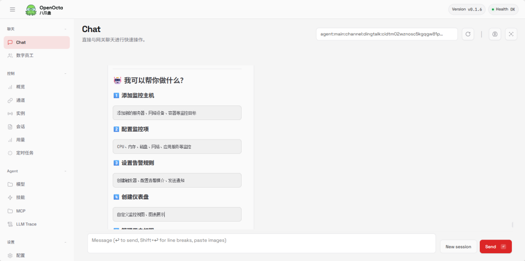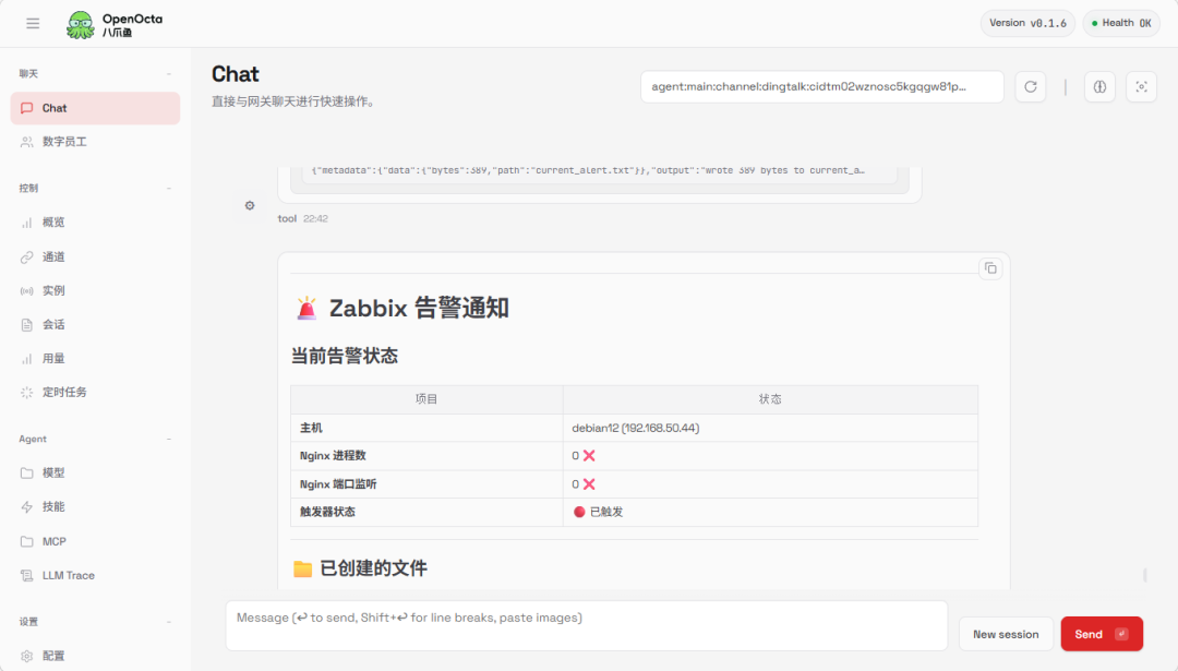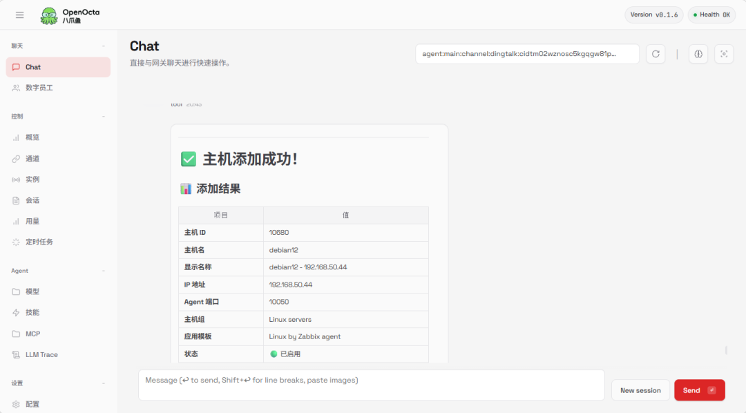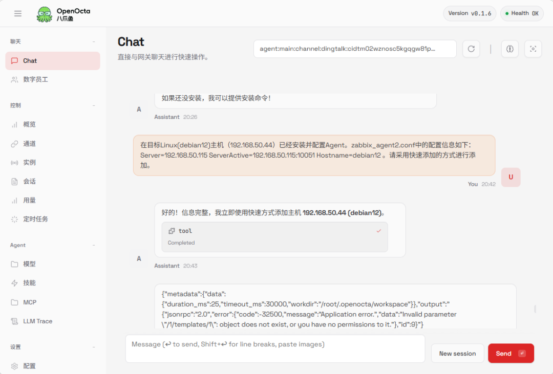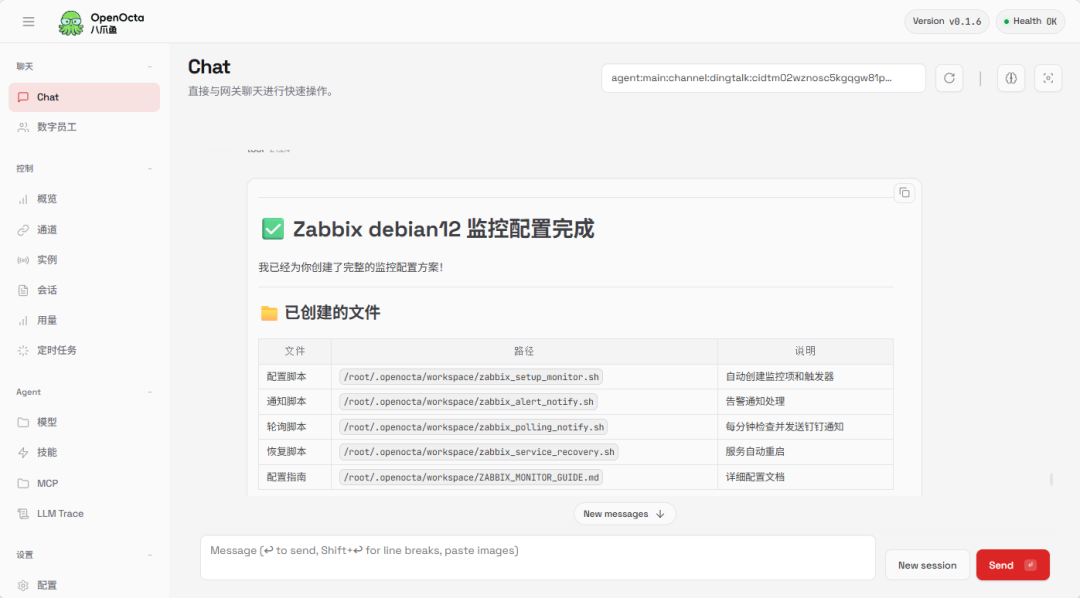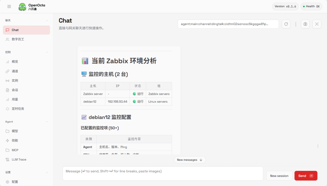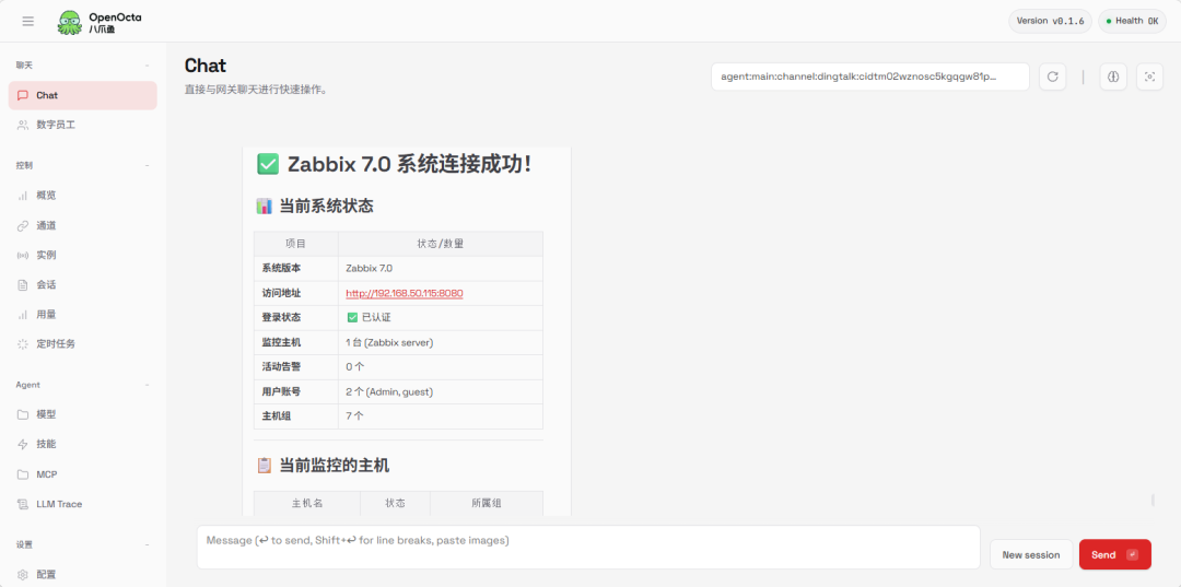 接下来,我们可以告诉OpenOcta,让它登录Zabbix,看看它能实现哪些功能。