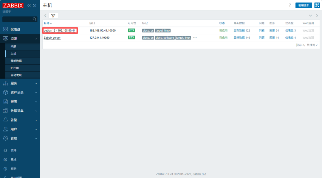 完成后,在主机信息中便可以看见刚才添加的主机已经上线了。