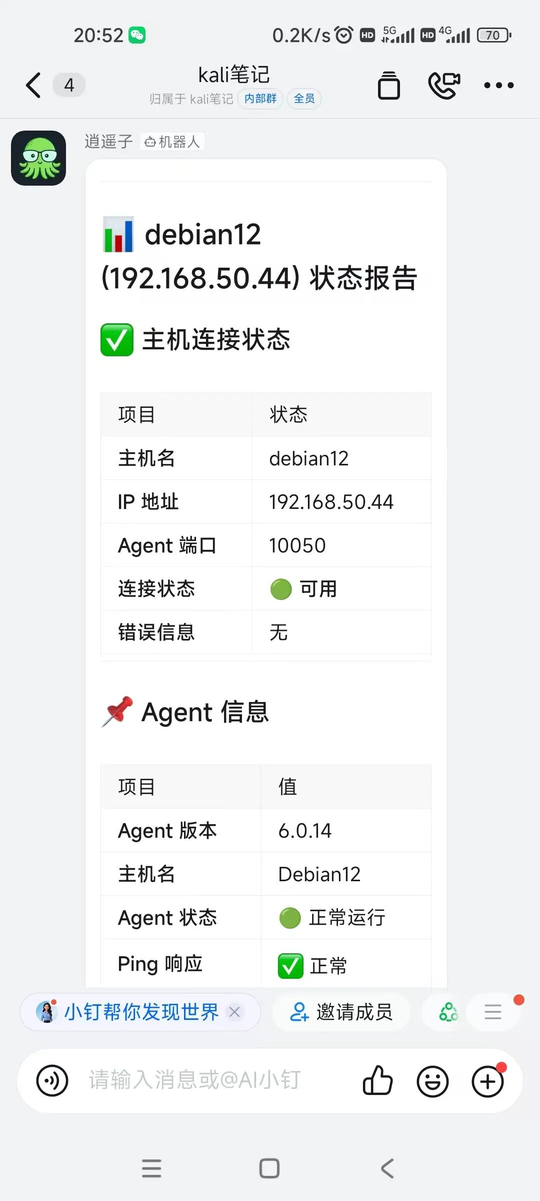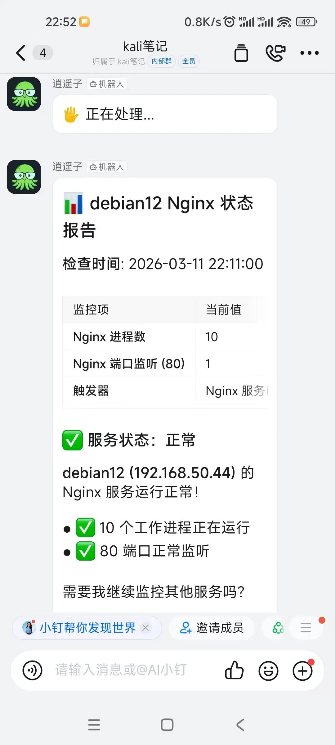 如图,当在触发器中配置nginx相关状态检测,若nginx停止后,便可以在钉钉中收到信息。若服务离线,可直接启动服务。