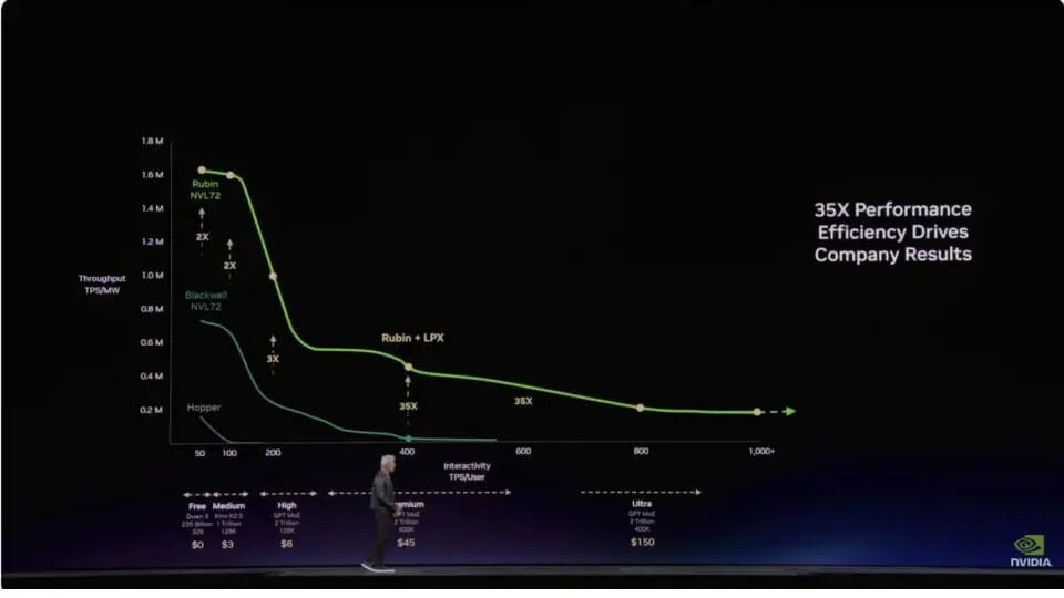 这就是Groq整合和英伟达200亿美元Groq投资开始有意义的地方。Rubin + LPX进一步将曲线向右延伸——在保持吞吐量的同时改善交互性。其含义是,能够在不降低曲线的情况下将曲线向右移动的平台,可以为对响应性敏感的使用案例收费,特别是在智能体工作流和边缘推理中。范围从免费增值(免费ChatGPT)到付费(20美元/月)到更高付费层级(200美元/月)再到编码辅助到超低延迟智能体——超级昂贵但值得,因为它驱动收入。