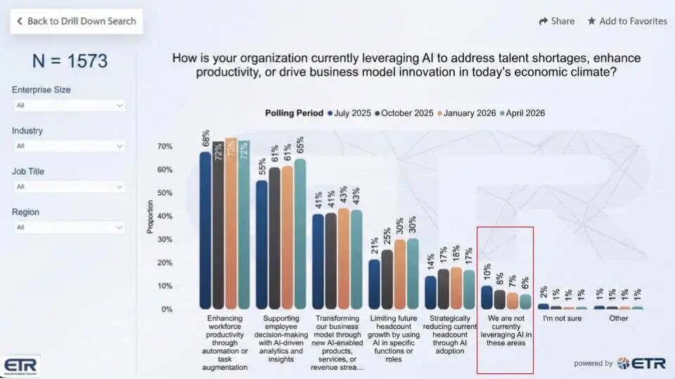 下图是对组织在当前环境下如何使用AI的核查(N = 1,573),自2025年7月以来一直持续提问。首要答案是意料之中的——通过自动化或任务增强来提升员工生产力。这一答案一直稳定在低70%的范围内,并在多个季度中保持持久。我们看到组织提出的问题是:我们如何取得超越早期用例的新突破?换句话说,企业看到了早期胜利,但它们渴望看到这些胜利复合增长。