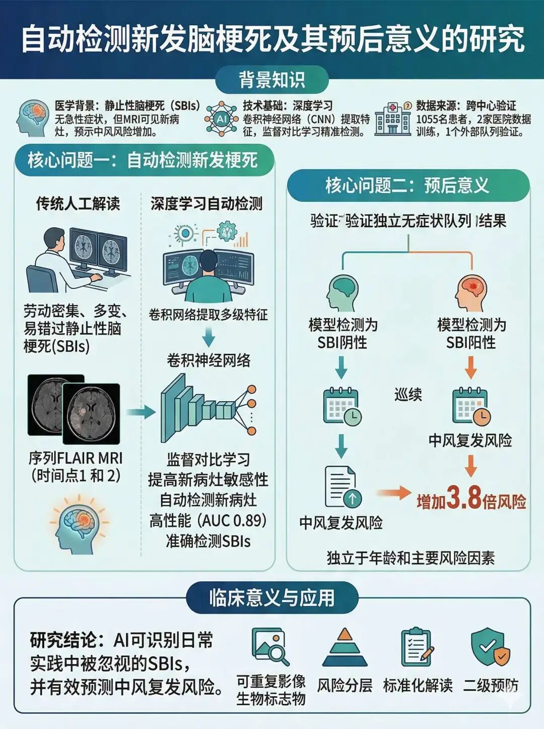 本研究旨在利用深度学习建立一套纵向FLAIR MRI新发缺血灶自动检测框架,弥补人工判读的不足,并通过下游预后分析验证其临床价值,为二级卒中预防的个体化风险分层提供可重复的影像生物标志物。