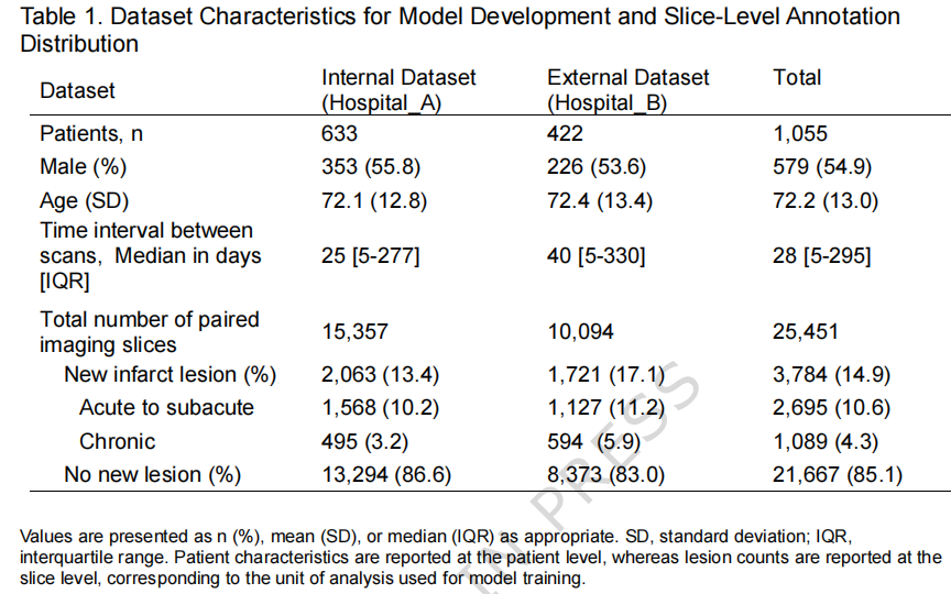 纳入韩国两所三甲医院2008—2023年共1,055例接受2次及以上脑MRI检查的患者,以医院_A(n=633)为内部训练与验证集,医院_B(n=422)为外部验证集,实现了空间独立的外部验证。