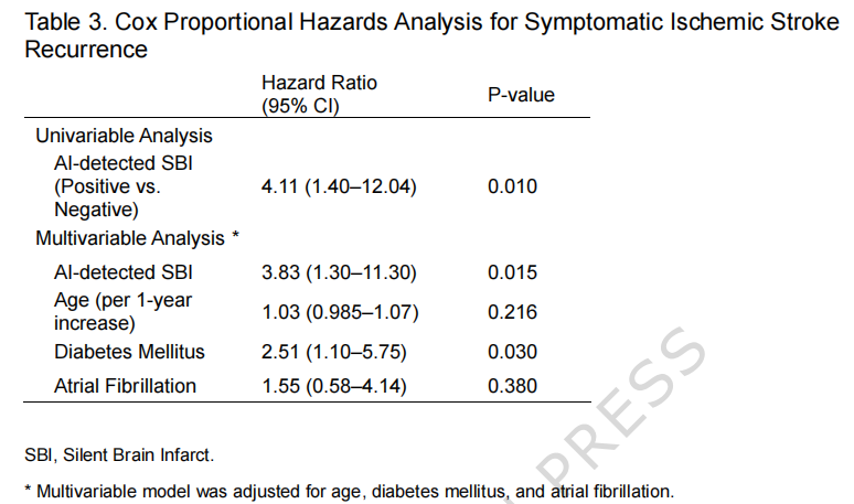 单因素Cox回归中,AI检测SBI阳性与症状性卒中风险增加4.11倍相关(HR 4.11, 95%CI 1.40–12.04, P=0.010);调整年龄、糖尿病及心房颤动后,独立风险仍显著(aHR 3.83, 95%CI 1.30–11.30, P=0.015);糖尿病为另一独立危险因素(aHR 2.51, P=0.030)。(Table 3)