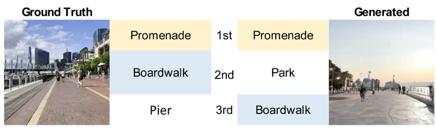 研究结果显示,SounDiT 可将地理语境声景到景观生成同时做到可控与可解释,并将听觉线索与场所语境连接起来,支持下游分析与设计。具体而言,它支持场景条件生成:在固定声景输入下,通过调整场景提示词即可生成视觉上不同、但在听觉线索与场景语境上保持一致的图像。