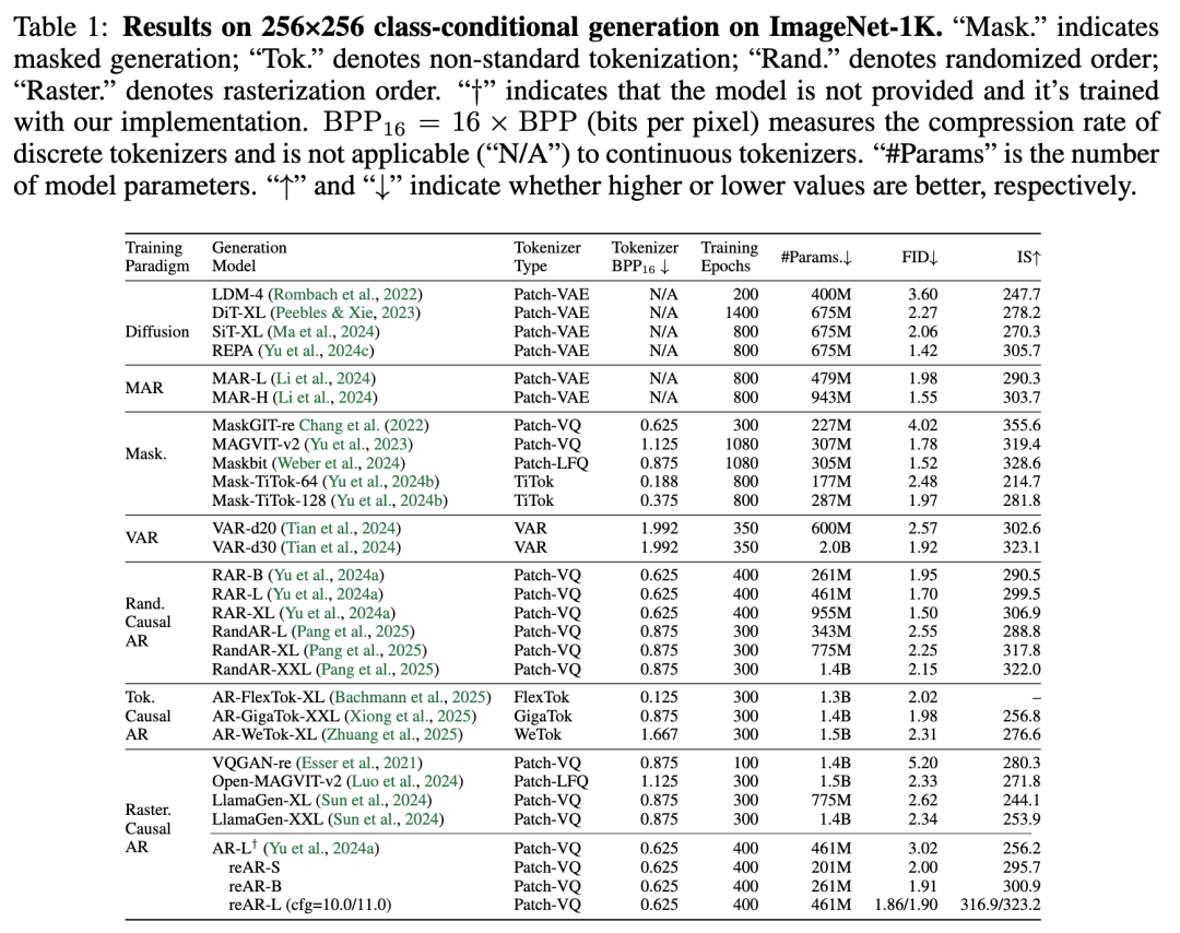 数据集和评估。 本文在 ImageNet-1K 256×256 分辨率上使用 ADM 协议评估 reAR。每个模型使用无分类器指导生成 50k 张图像。本文报告 FID(越低越好)和 IS(越高越好),并通过 epoch 数和达到相同质量所需的参数量来比较训练效率。基线涵盖扩散模型、掩码生成(连续和离散)、VAR、随机顺序 AR、高级分词器 AR 和标准光栅 AR(参见表 1)。