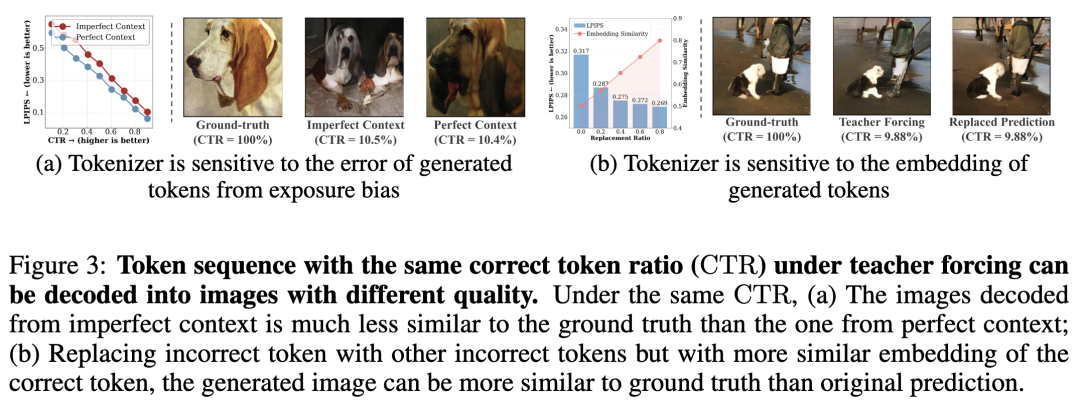 由于两种协议都将真实 token 的数量固定为 ,因此下游质量的任何差异都反映了对暴露偏差的敏感性,而不是 token 级别的准确性。结果显示在图 3(a) 中。对于可比较的 CTR,不完美上下文始终比完美上下文产生更高的 LPIPS。从定性上看,不完美上下文导致图像与原始图像显著偏离,而完美上下文产生更好的预测,即狗的布局更相似。这突出表明缓解暴露偏差在视觉自回归生成中至关重要。