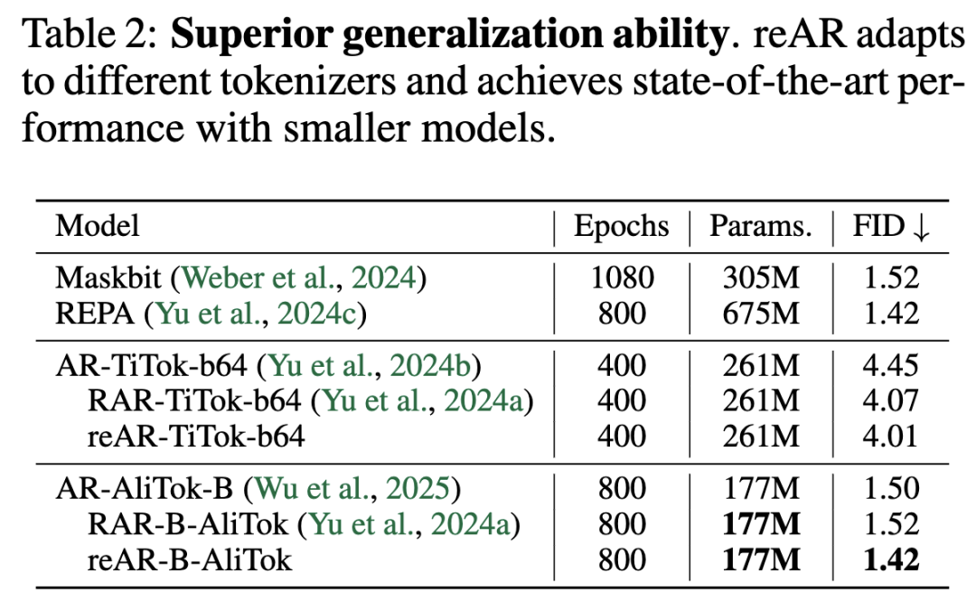泛化能力。 本文还在非标准分词器 TiTok和 AliTok上评估了 reAR。与主要帮助双向分词的 RAR不同,reAR 始终改进了双向 (TiTok: 4.45 → 4.01) 和单向 (AliTok: 1.50 → 1.42) 分词器的性能。值得注意的是,它接近基于扩散的 REPA并优于 Maskbit,同时使用更少的参数(177M vs. 675M/305M),具体数据如表 2 所示。