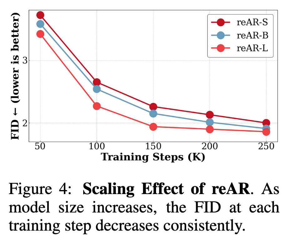 缩放效应。 本文还研究了 reAR 是否能保持原始 AR 模型的缩放行为。具体而言,本文绘制了不同模型大小在不同训练 epoch 下的 FID。如图 4 所示,随着模型大小和训练迭代次数的增加,FID 持续下降,这揭示了 reAR 在大规模视觉 AR 模型上的潜力。