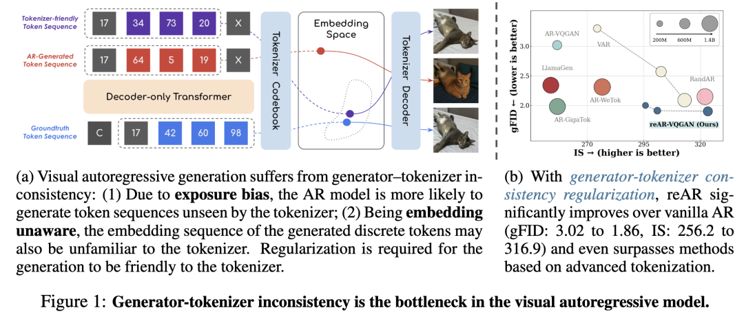 视觉自回归(AR)生成模型在图像生成方面的性能显著落后于扩散模型。研究人员发现其核心瓶颈在于生成器-分词器之间存在不一致性。具体表现为: