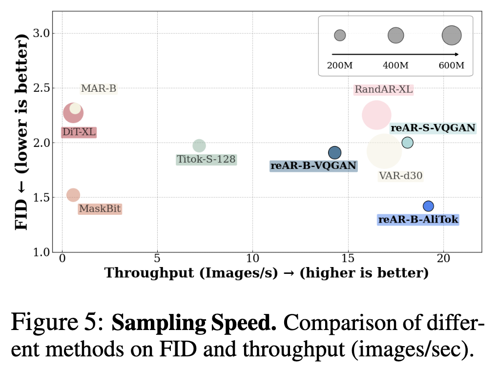 采样速度。 如同其他自回归模型,reAR 受益于 KV-cache 以实现高采样速度。本文在单个 A800 GPU 上测量了批量大小为 128 的吞吐量(如图 5 所示)。通过 KV-cache,自回归模型的运行速度比扩散模型和 MAR 快得多。此外,reAR-B-AliTok 即使与 Maskbit、TiTok、VAR 和 RandAR 等并行解码方法相比,也能以更快的采样速度实现更低的 FID。