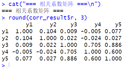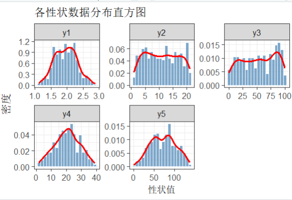 五个性状,量纲差异极大——y1 在 1~3 之间,y5 能跑到 130+。这个信息先记下来,后面标准化用得上。