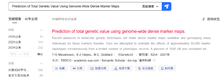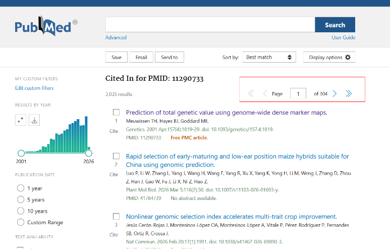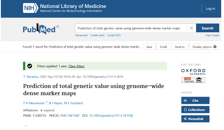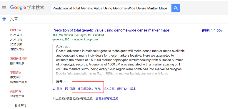 经典文献《Prediction of total genetic value using genome-wide dense marker maps》,在PubMed中可直接查到被引304篇,数据针对性极强。