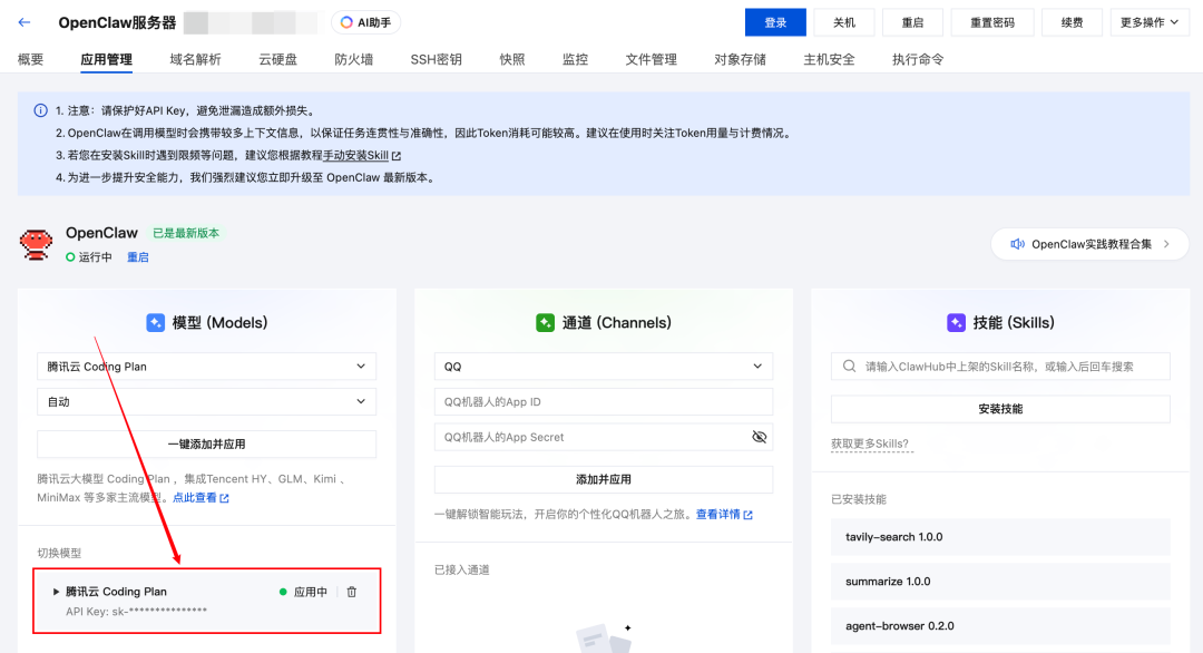 基于OpenClaw应用模版完成服务器创建后,此时OpenClaw也已经同步在服务器中完成安装部署。在轻量云控制台界面中,点击服务器实例卡片中的“…”按钮,选择管理实例,即可进入实例管理页面,进行后续的OpenClaw模型配置和通道配置操作,