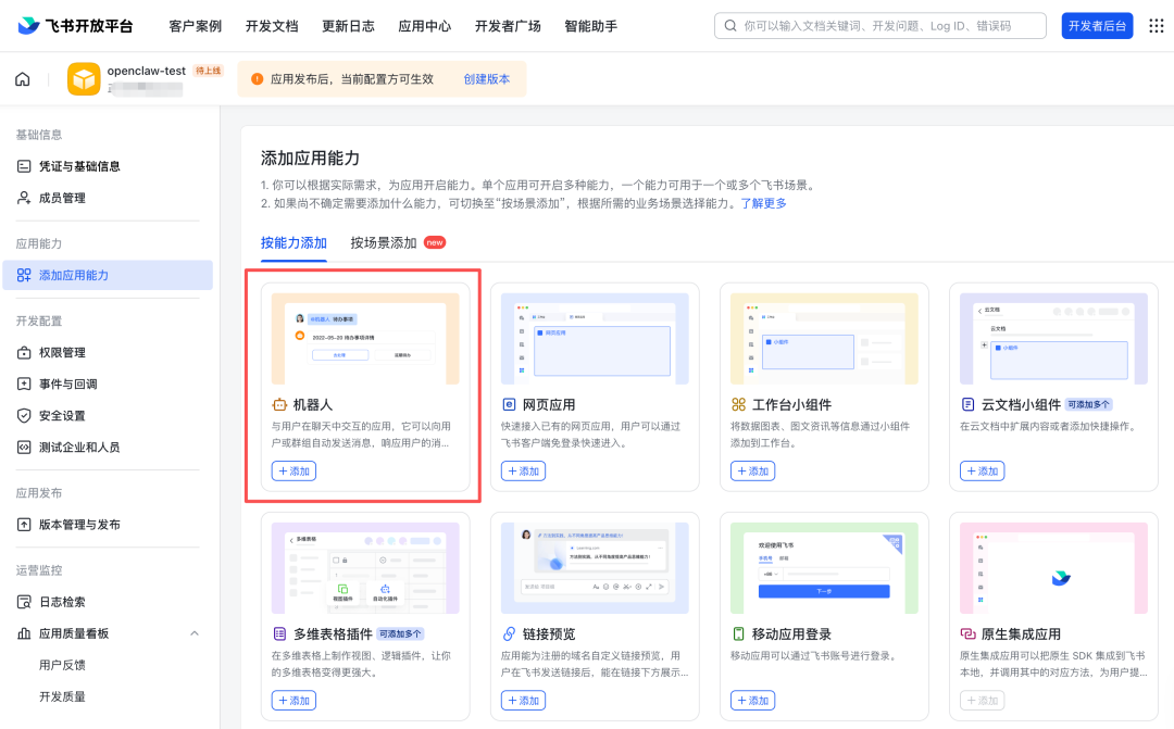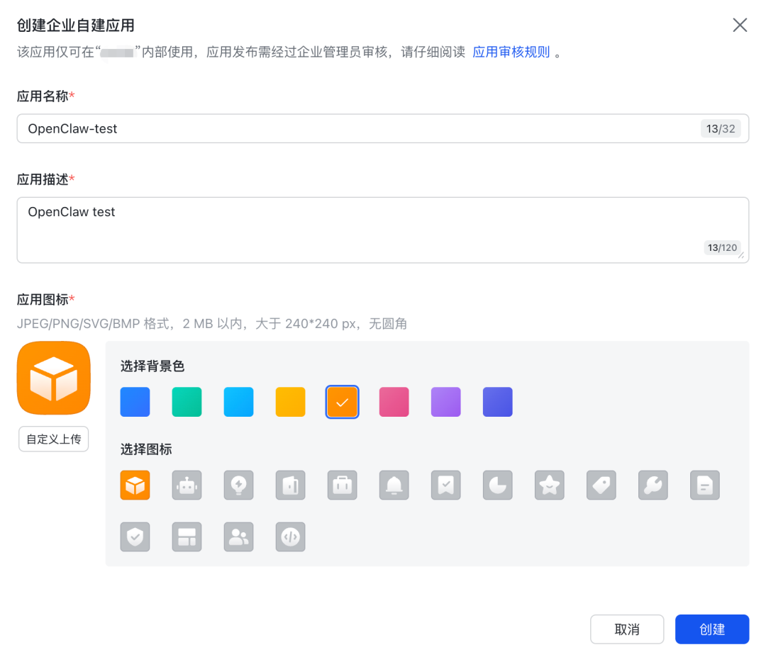 填写应用名称(如"OpenClaw助手")、应用描述,选择应用图标,点击创建按钮,进入应用管理页面,