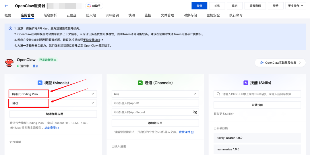 在OpenClaw配置面板中选择腾讯云Coding Plan并选择具体使用的模型,默认为"自动",会通过算法自动匹配最优模型,