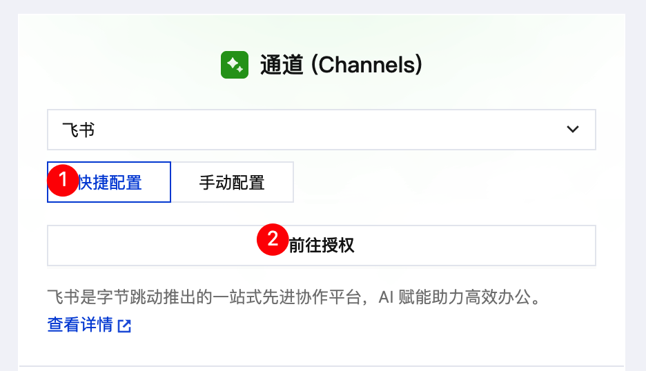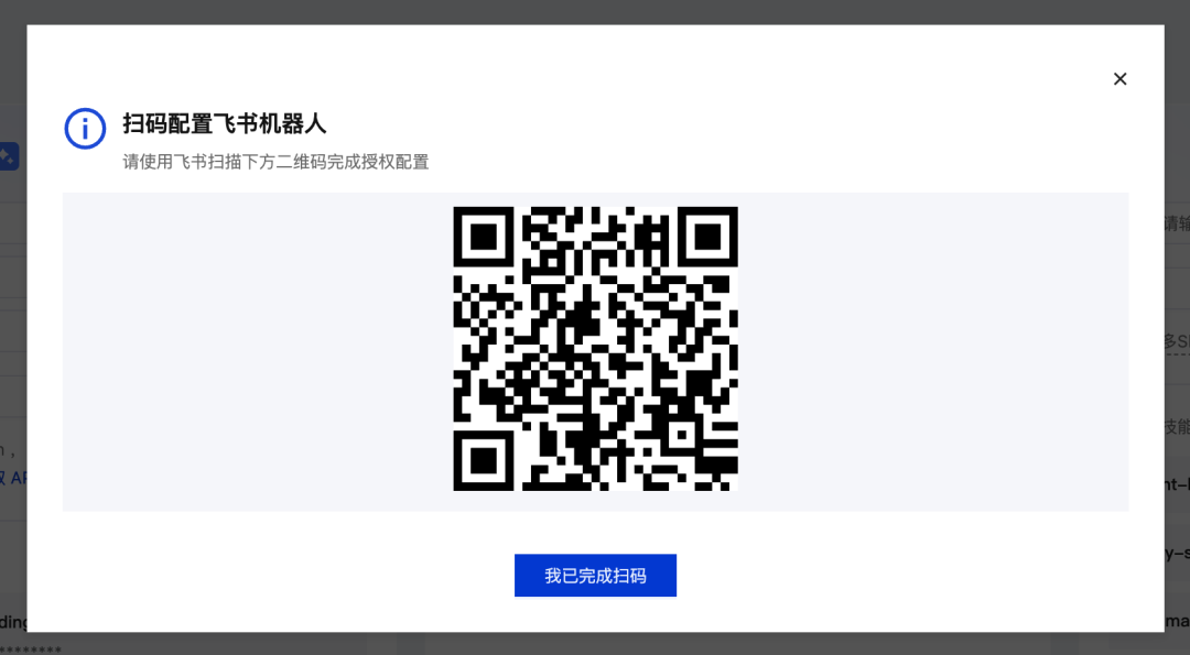 随后飞书机器人将自动进行配置,等待弹出"飞书机器人授权配置成功"后,则代表快捷配置已完成,