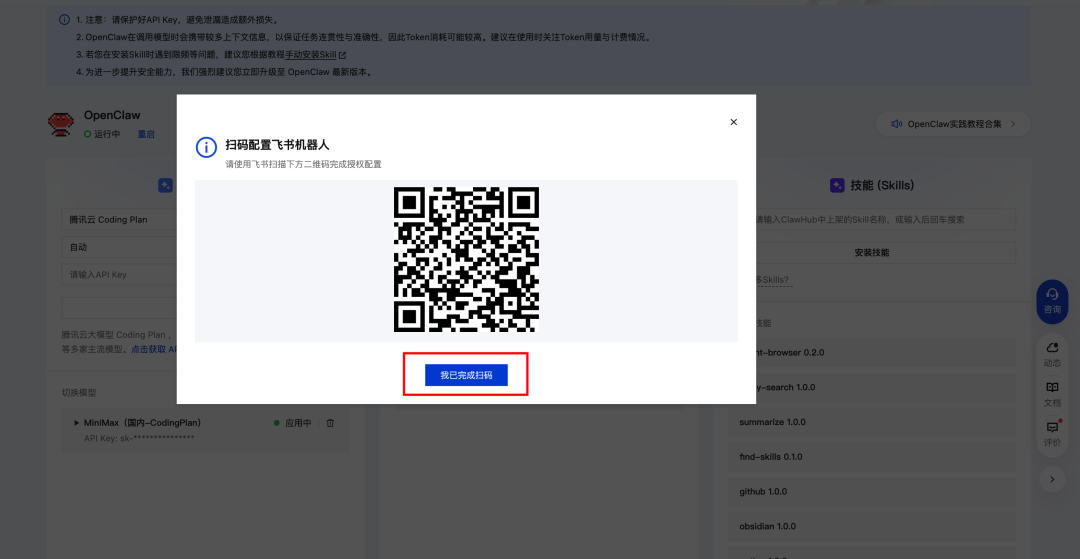 扫码后,在飞书App内选择"继续授权登录",完成登录后,返回腾讯轻量云Lighthouse应用管理页面,点击弹窗中的"我已完成扫码",