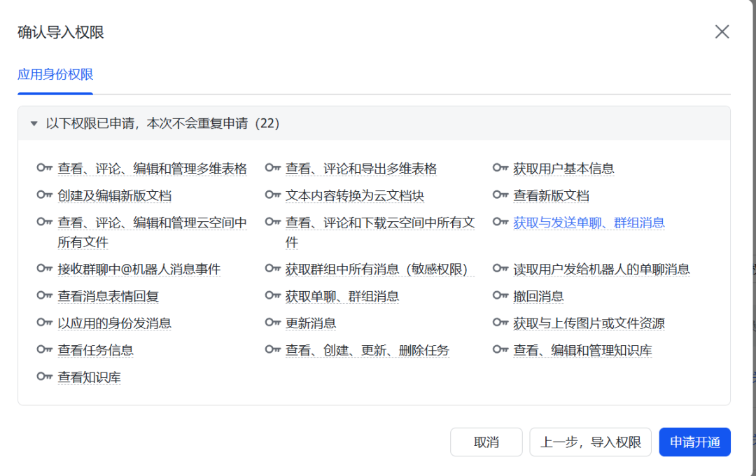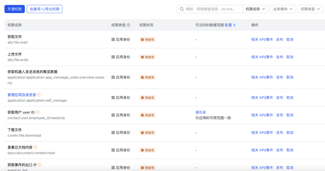在飞书应用管理页,左侧导航栏找到"权限管理",点击进入页面。点击页面中的"批量导入权限"按钮,弹出权限导入窗口,