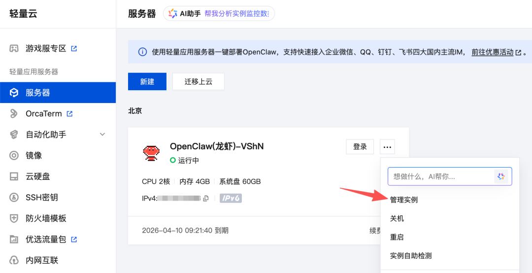 首先进入轻量云产品控制台,选中对应的已部署OpenClaw的轻量应用服务器,点击之后进入"管理实例"页面,