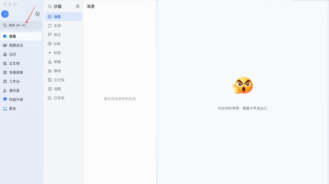 完成前面的步骤之后,就可以和飞书机器人进行单独聊天,或者将飞书机器人添加进群聊。以电脑版飞书软件为例(手机端飞书的操作类似),登录飞书后,点击搜索框,
