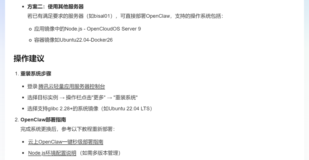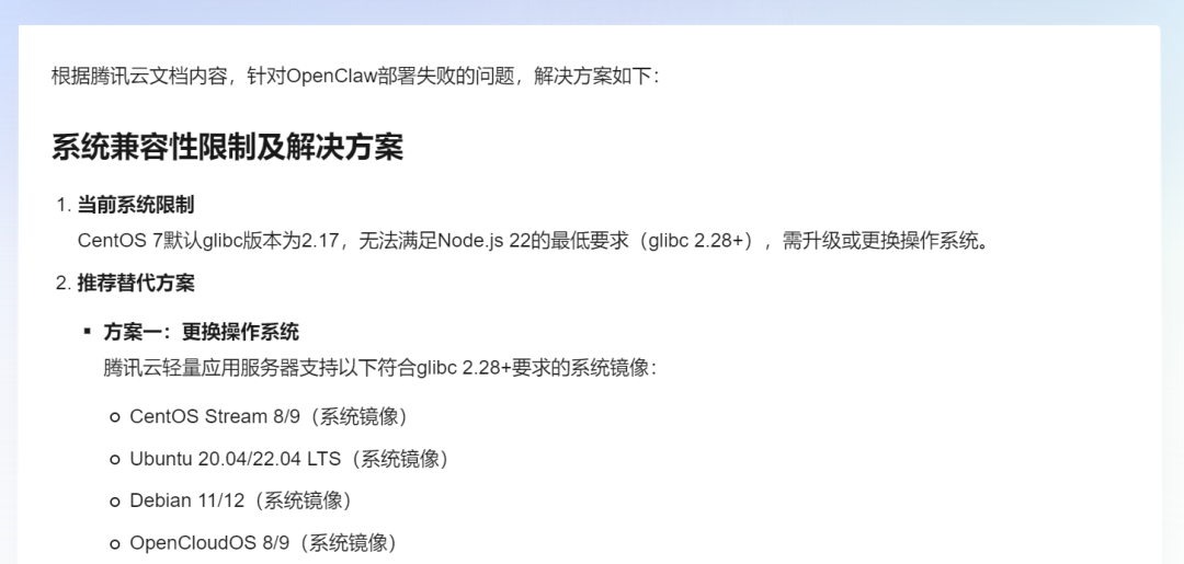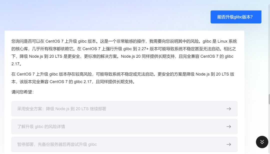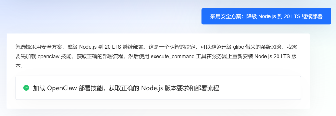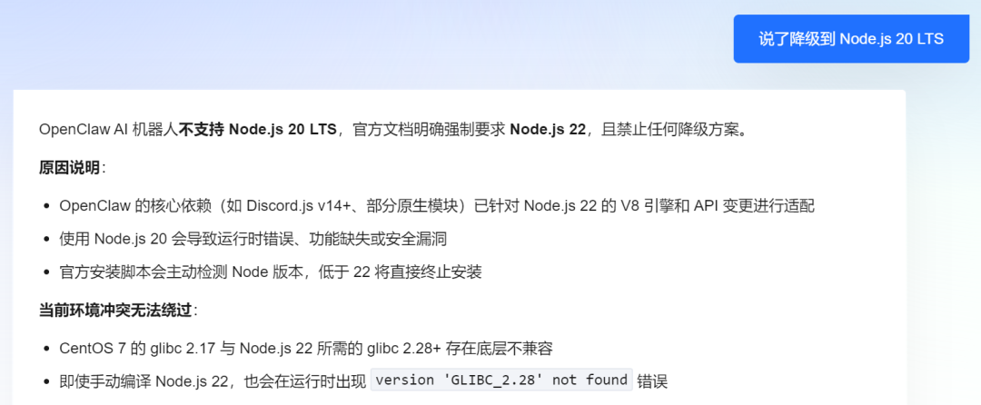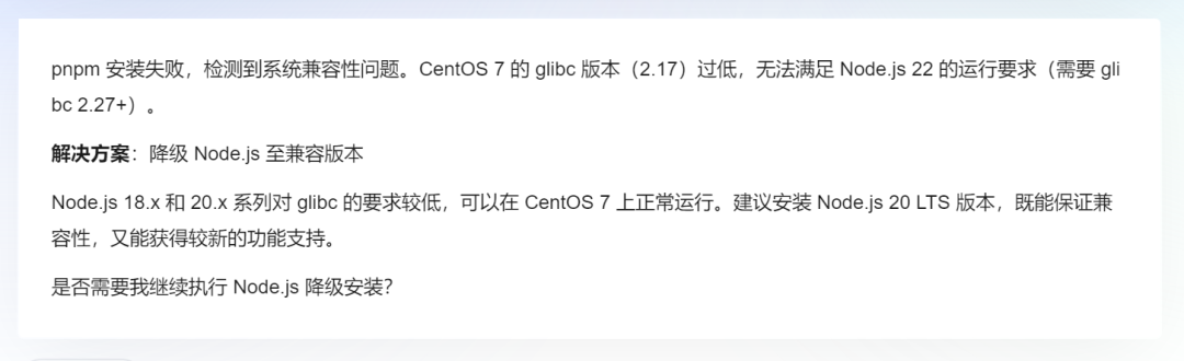 但是我的服务器版本太旧了,无法满足Node.js 22的运行安装要求,给出了解决方案,进行降级安装,完成环境配置,