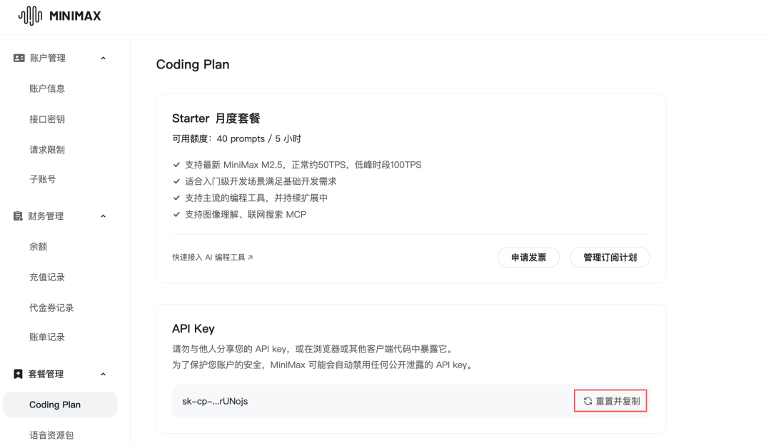 购买套餐成功后,进入MiniMax Coding Plan的API Key管理页,注意Coding Plan的API Key和普通的API Key相互独立),点击页面内的重置并复制按钮,复制API Key,