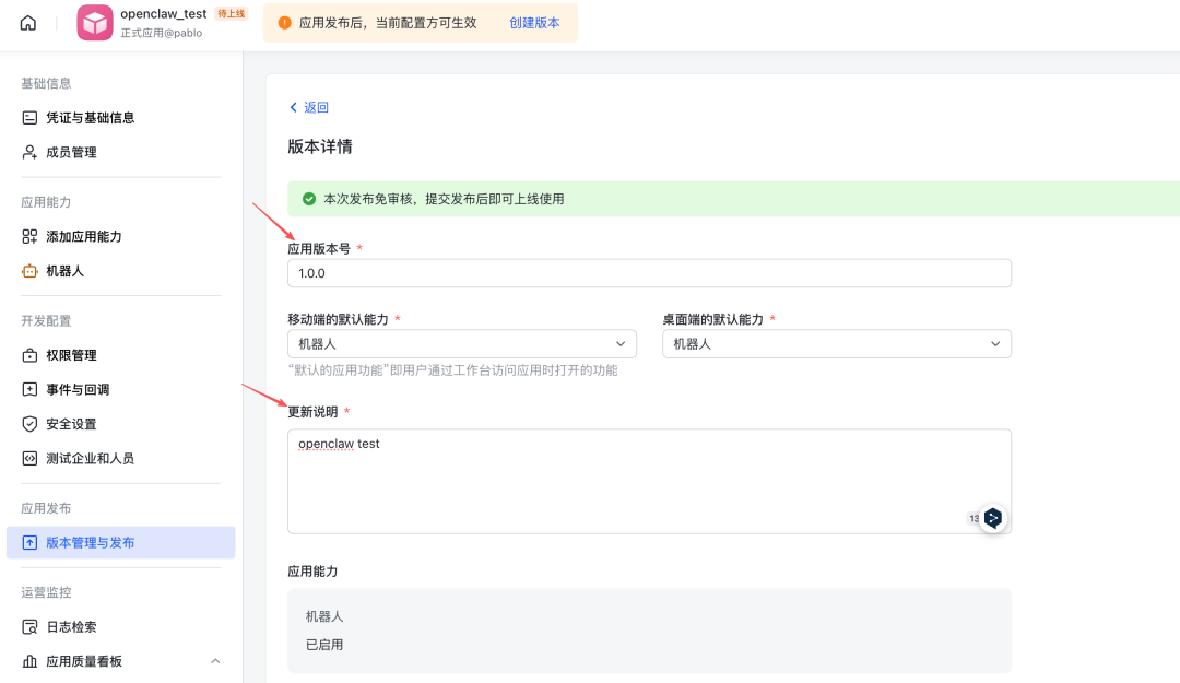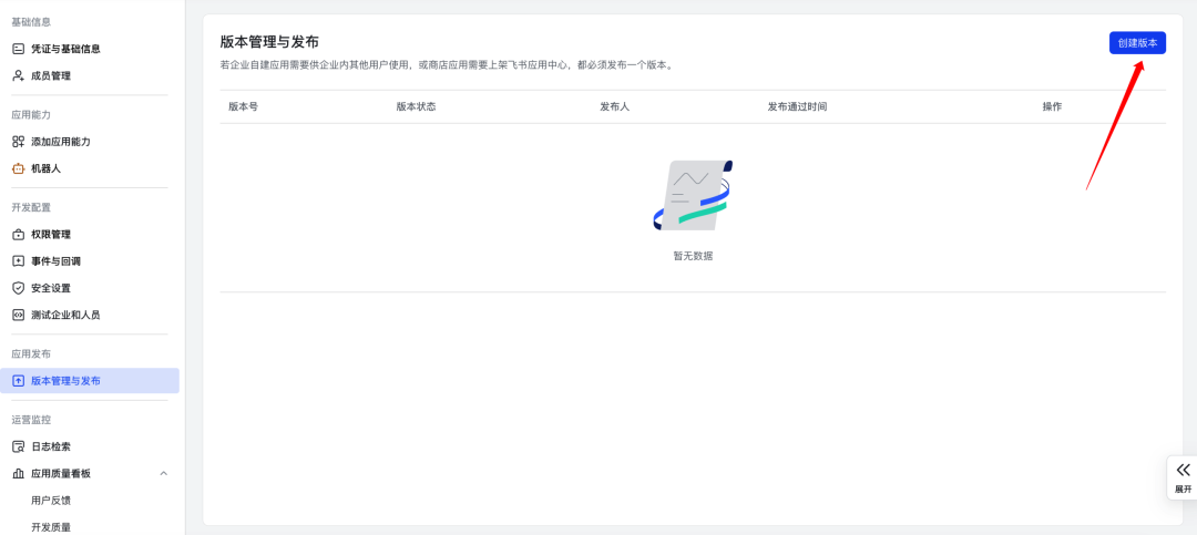 在飞书应用管理页,左侧导航栏找到"版本管理与发布",点击进入页面。点击右上角的创建版本,