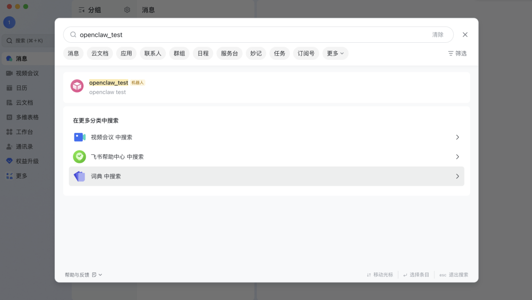 在搜索框中输入前面步骤中创建并发布的飞书机器人的应用名称,输入回车进行搜索,