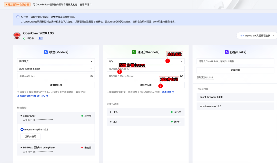 接下来即可在控制台界面上进行OpenClaw的模型(Models)配置、通道(Channels)配置(包括QQ、企微、钉钉、飞书等)。