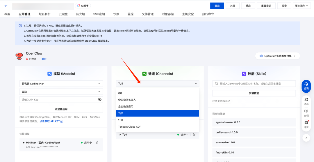 提示:OpenClaw支持同一台服务器配置多个通道,例如支持同时接入QQ机器人和飞书机器人。因此,如果当前正在配置的服务器之前已经接入了其他通道,也可以继续添加通道。