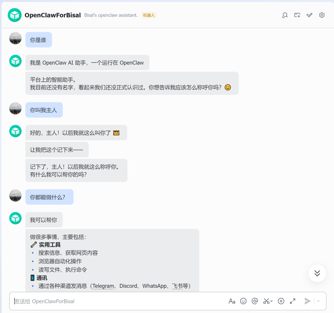 接下来继续尝试与该机器人进行对话,如果机器人以AI的方式进行回复,如下这种的即说明配对成功,