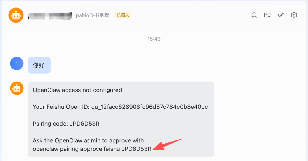 单击搜索到的机器人,进入私聊页面,即可开始与已经接入OpenClaw的飞书机器人进行对话。首次对话会如果提示如下图所示的配对(Paring)请求,可以复制机器人回复的最后一行命令行,