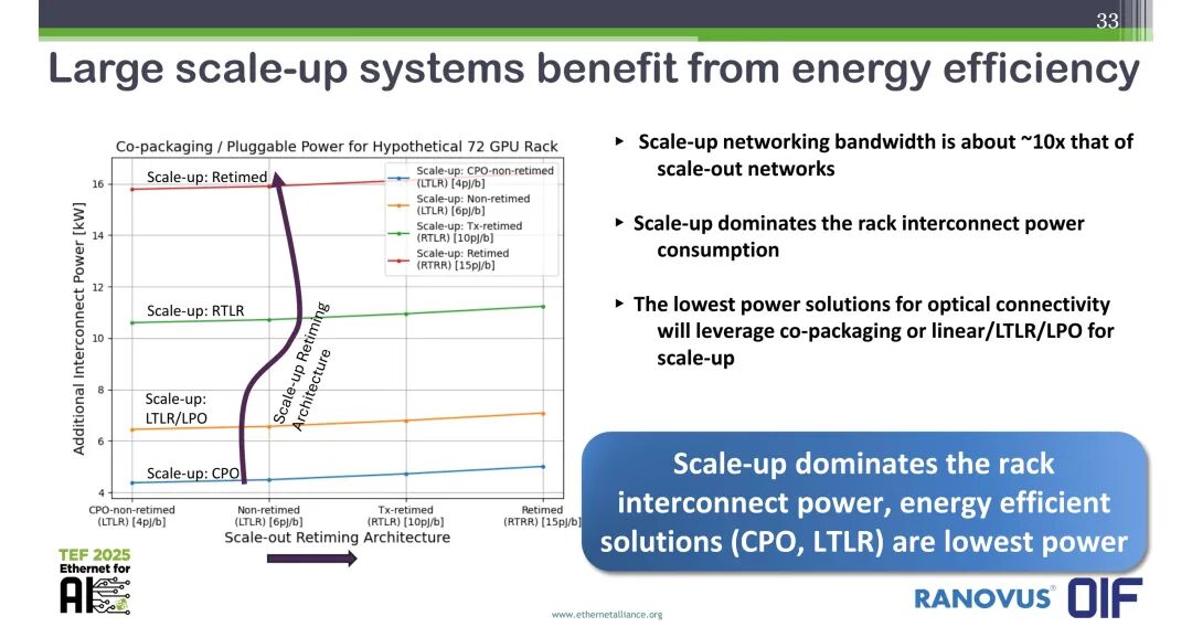 能效方面,针对72GPU机架的假设场景,不同光架构的功耗存在显著差异:非重定时的CPO(LTLR)功耗最低,约4pJ/b;非重定时的LTLR/LPO功耗约6pJ/b;Tx重定时的RTLR功耗约10pJ/b;全重定时的RTRR功耗约>15pJ/b。