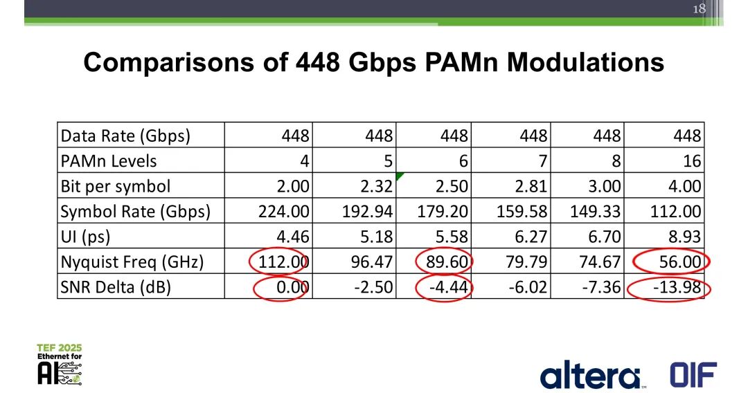 448Gbps速率下,不同PAMn调制的核心参数存在显著差异,直接决定了信道适配能力、SNR需求与实现复杂度: