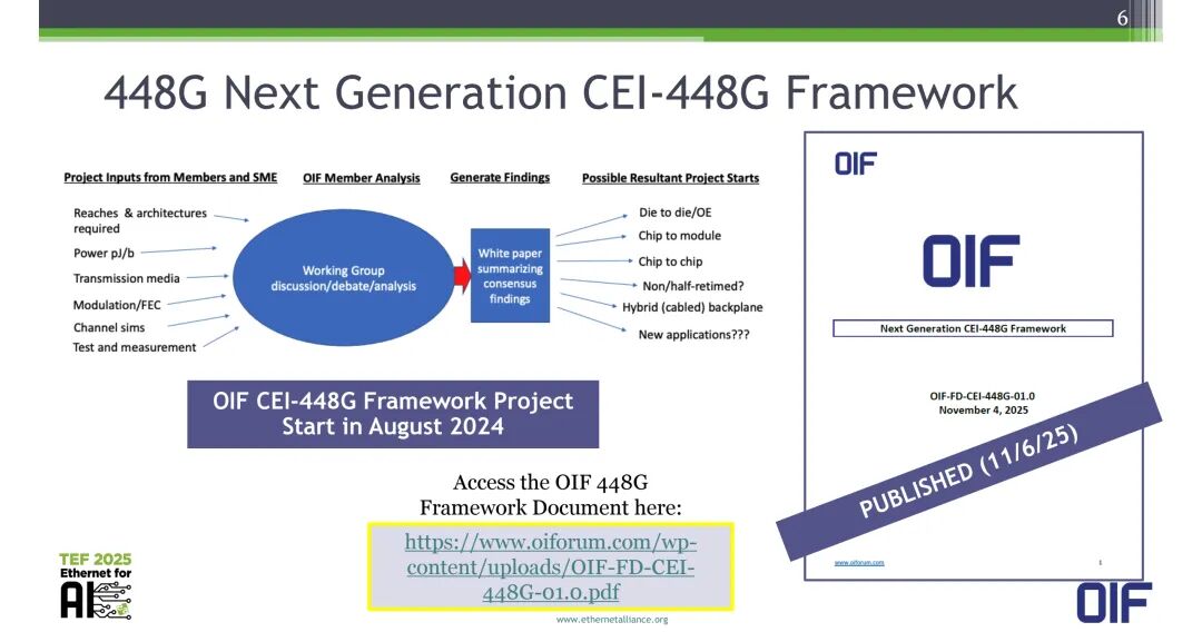 项目核心输出包括白皮书,以及后续可能启动的具体标准化项目,覆盖Die-to-Die/光电引擎、芯片到模块、芯片到芯片等场景,以及潜在的新应用。该项目的框架文档OIF-FD-CEI-448G-01.0已于2025年11月4日完成,并于2025年11月6日正式发布。