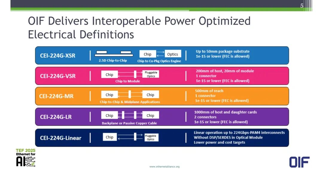 在CEI-448G项目启动前,OIF已完成CEI-224G系列接口的标准化定义,为下一代技术迭代奠定了成熟基础,包括XSR、VSR、MR、LR、Linear等不同规格