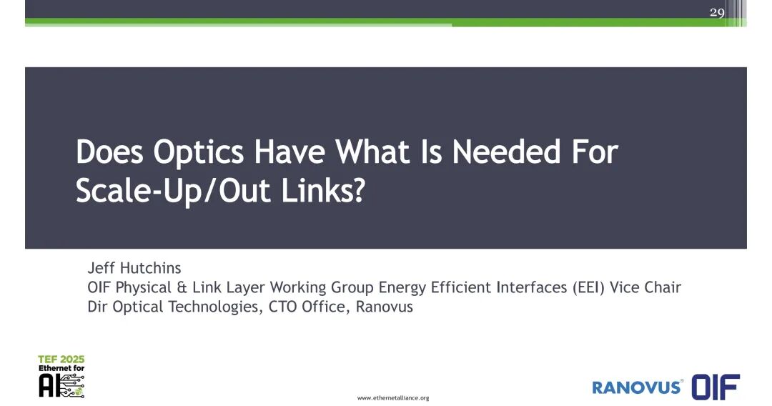 Jeff Hutchins的分享围绕AI集群Scale-Up/Out场景的光互连需求、能效与可靠性要求、技术选型与成本优化展开。
