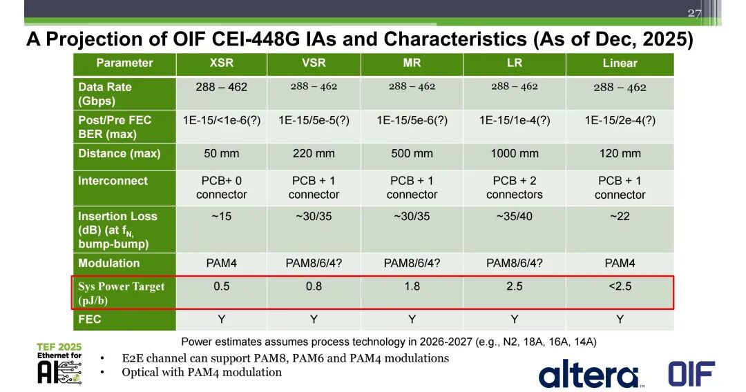 基于仿真与产业共识,Mike Li明确了CEI-448G各接口的核心参数:XSR、VSR、MR、LR、Linear接口均支持288-462Gbps的速率范围,所有接口均支持FEC功能,功耗预估基于2026-2027年的工艺节点(如N2、18A、16A、14A):